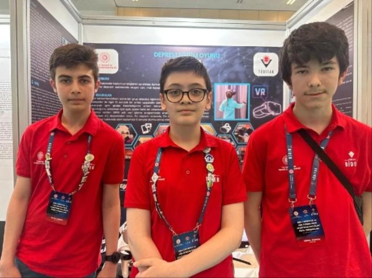'3 AŞAMADAN OLUŞUYOR'Projenin mimarlarından Kaan Turgun, deprem için verilen eğitimlerin daha çok afiş ve videodan oluştuğunu belirterek, "Bu videoların çok yeterli olmadığını düşündük ve bu oyunu geliştirdik. Bu oyundaki hedef kitlemiz; daha çok daha küçük yaşlardaki öğrencilerdi. Küçük yaşlardaki öğrencilerin dikkatini çekmek için de oyunu daha renkli ve akılda kalıcı şekilde geliştirdik. Oyun, 3 farklı aşamadan oluşuyor; deprem öncesi, deprem anı ve deprem sonrası. Oyunda ev ve okul haritası var. Oyuncu, deprem çantasını kullanarak ve 'çök-kapan-tutun' hareketini yaparak, hayatta kalmaya çalışıyor. ve eğer hayatta kalırsa oyunu kazanmış oluyor. Okul haritasında ise oyuncuya okuldaki panolara afiş asma görevi veriliyor. Afişleri astıktan sonra deprem oluyor. Oyuncu bu anda okuldaki sıraların yanlarına giderek 'çök-kapan-tutun' hareketini yapıyor. Depremde okul yıkılmıyor ve oyuncunun hızlı bir şekilde okulu terk etmesi gerekiyor" dedi. SANAL GERÇEKLİK GÖZLÜĞÜ İLE OYUNOyunun geliştiren öğrencilerden Akif Bera Öçal ise oyunu ilk başta sadece bilgisayarda oynanacak şekilde geliştirmeyi düşündüklerini ancak 6 Şubat'ta meydana gelen depremlerden sonra daha çok kişiye yaymayı düşündüklerini belirterek, "Daha sonra oyunu mobil olarak oynanacak şekilde de geliştirdik. Geliştirdiğimiz Android versiyonunu indirilebilir hale getirdik. Oyunumuzun en çok ilgi gören kısmı da bu Android versiyonu oldu. Oyunu ayrıca sanal gerçeklik gözlüğüyle oynanabilecek şekilde de geliştirdik ki; yapabileceğimiz teknoloji gösterebilelim. Oyunun tüm kodlarını ve modellerini tamamen biz geliştirdik. Başka bir yerden, bir şey almadık" diye konuştu.Öğrencilerden Kemal Yüksek de Milli Eğitim Bakanlığı'ndan izin alarak 2 farklı ortaokulda oyunu oynayan 50 öğrenci ile anket yaptıklarını söyleyerek, "Öğrencilere oyunu oynamadan önce ve oyunu oynadıktan sonra 15 soru sorduk. Sonuçları istatistiksel analize yönelik bir bilgisayar programı ile karşılaştırdık ve bu 15 sorunun 10'unda anlamlı sonuçlar elde ettik. Öğrencilerin oyunu oynayarak deprem konusunda bilinçlendiği ortaya çıktı" dedi.