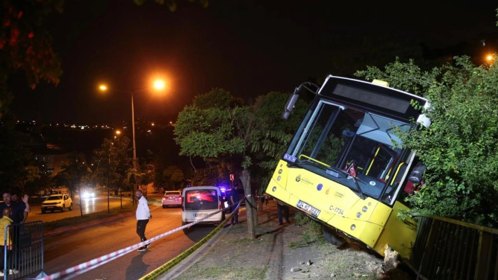 Kaldırımdaki ağaçları ve demir korkulukları kıran otobüs, bir evin bahçesine düştü.