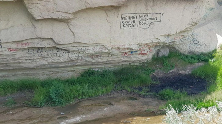 Gomeda’da 8 kilometre yürüyen Adanalı doğa tutkunları, Mustafapaşa (Sinasos) köyünde mola verdi. Burada, vadideki oyma tarihi yapılara sprey boyayla aşk mesajlarından onlarca kadın ve erkek isimlerinin yazıldığı görüldü.