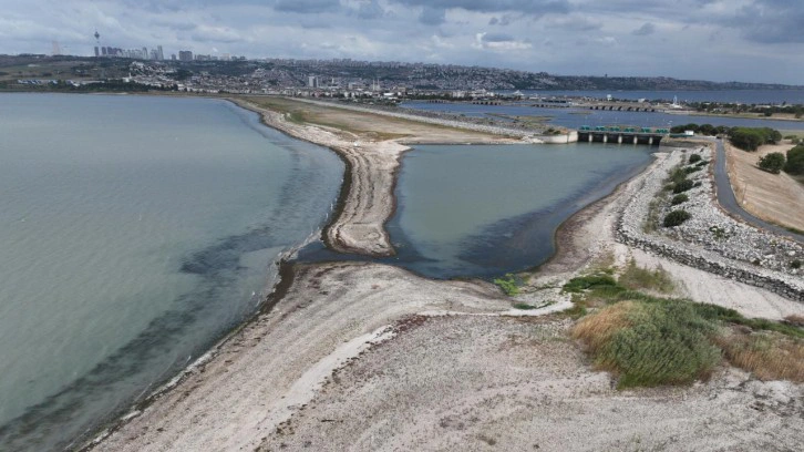 Çekilme yaşanan Büyükçekmece Baraj Gölü'nde de çarpıcı görüntüler ortaya çıktı. Yüzde 15 seviyelerine inen baraj gölünde kara parçaları ortaya çıktı.