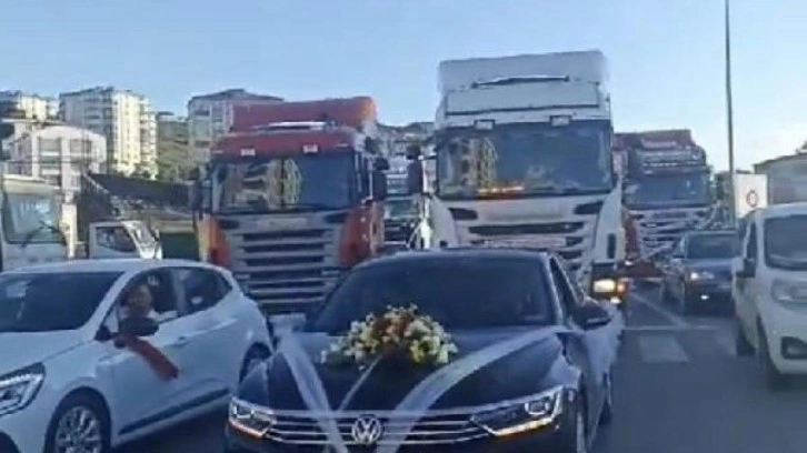 İlkadım ilçesinde, 30 Temmuz'da düğünleri yapılan İpek Nur-Rahmi Arslan çiftinin konvoyuna, TIR şoförü olan damadın arkadaşları 10 TIR ile katıldı.